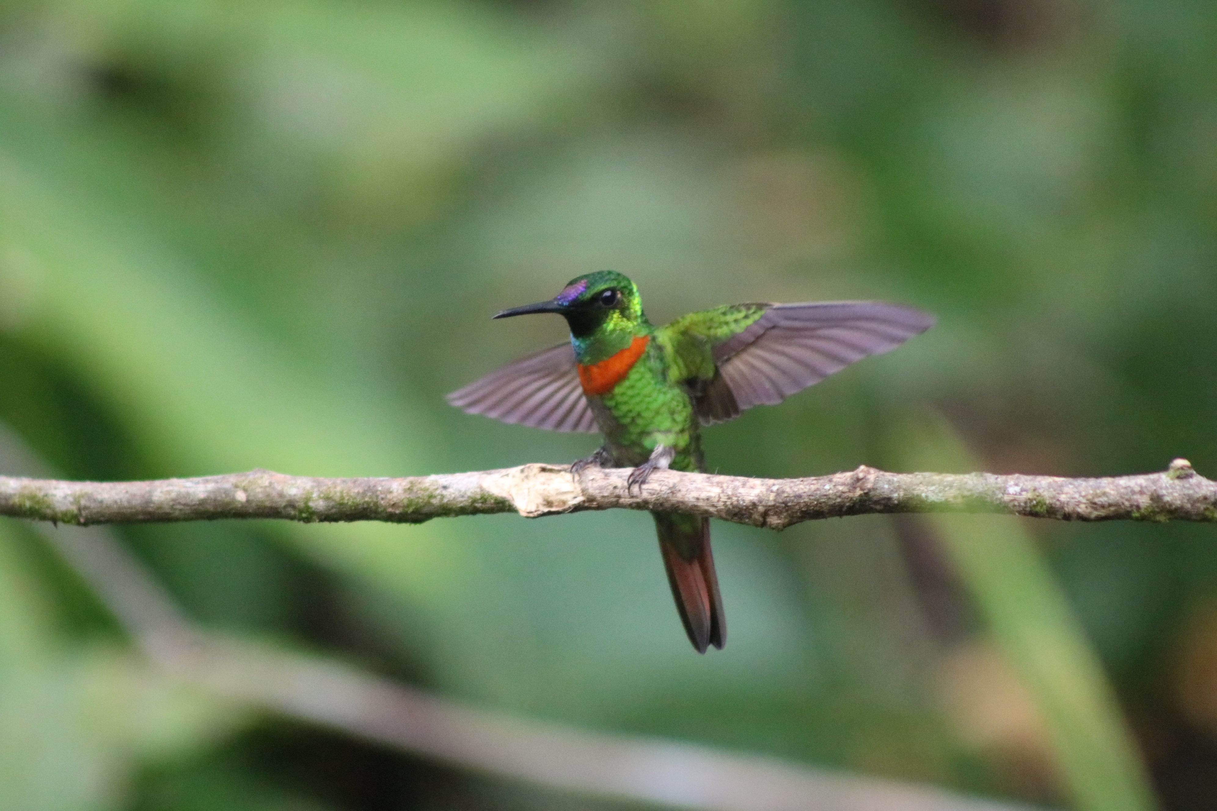 Este tipo de hábitat es muy especial, ya que varias especies de aves de las tierras altas y bajas se entremezclan en esta elevación. Es posible que tengamos la oportunidad de observar especies exóticas de aves como las tangaras carmesí, gris azulada y paradisíaca, el trogón coronado azul, el guacamayo cabeciazul, el jacamar de frente azulada, el guacamayo militar y especies de loros en peligro de extinción que solo viven en esta altura. En el camino haremos paradas en los jardines de colibríes, donde podremos apreciar muchos colibríes, pájaros carpinteros, barbos, guacamayos o quizás veamos algunos monos.