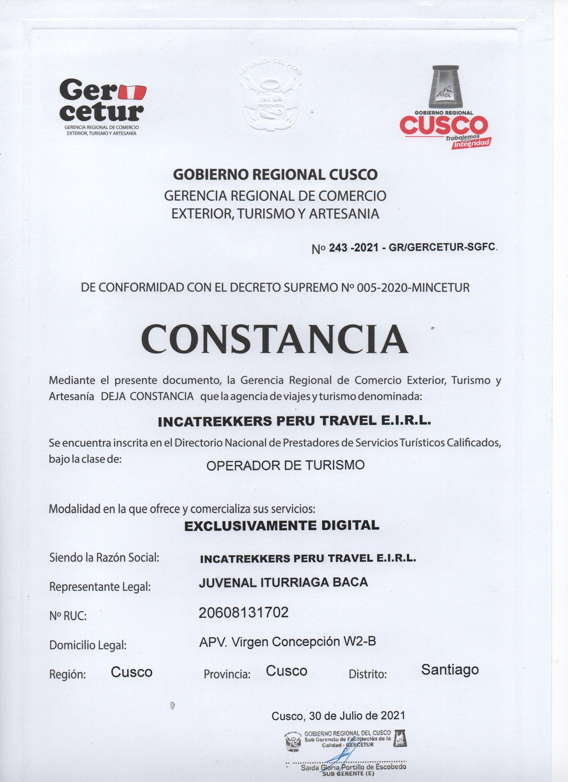 Operator License from the local governing authorities in Cusco: Our operations are approved and recognized by the local governing authorities in Cusco, the gateway to the Inca Trail. This endorsement highlights our dedication to operating within the legal framework and respecting the cultural heritage of this remarkable region.